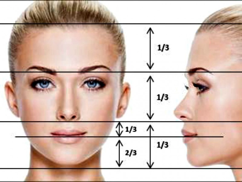 Il viso viene idealizzato in tre parti uguali, da capelli a sopracciglia, da sopracciglia a labbro superiore e da labbro superiore a mento, seguendo la “regola della sezione aurea”